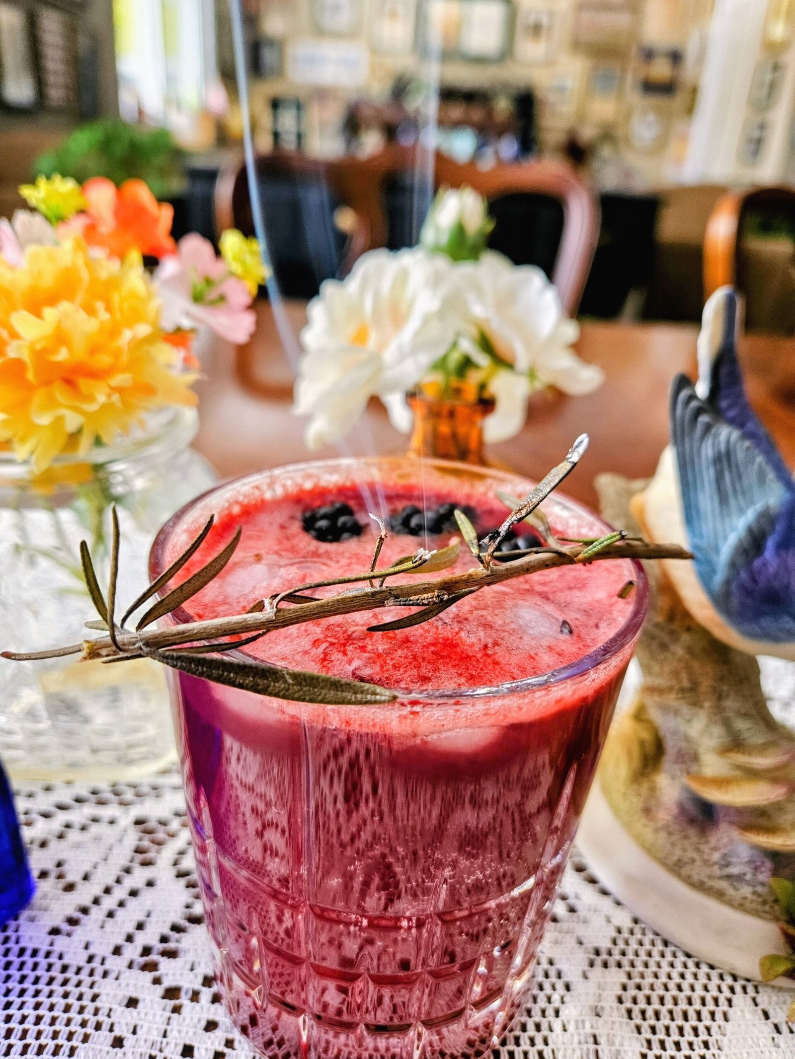 - Light the tip of the rosemary until it smolders and place atop the glass.